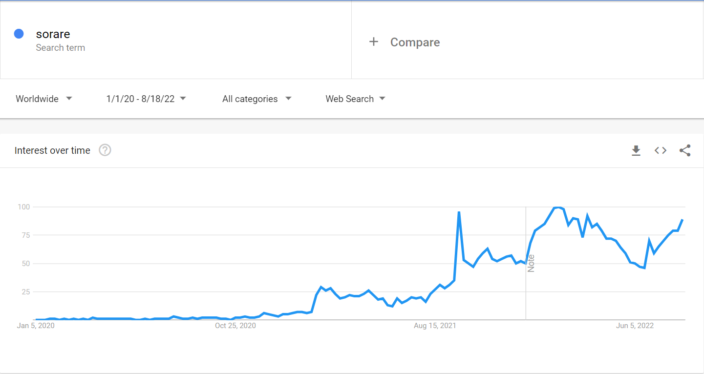Since its launch in 2019, Sorare google search trend has been increasing. According to the data from OpenSea, Sorare NFT collections of 330.8k has over 17.2k owners.