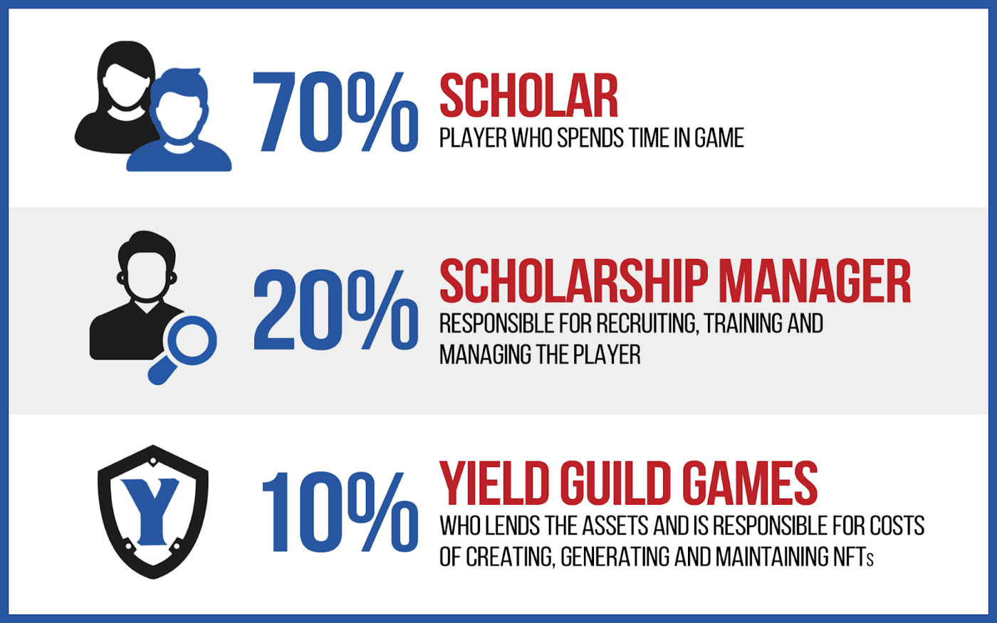 Currently, in the Yield Guild Games, the rewards are split into 70% for Scholar, 20% for Manager, and 10% for Yield Guild Games.