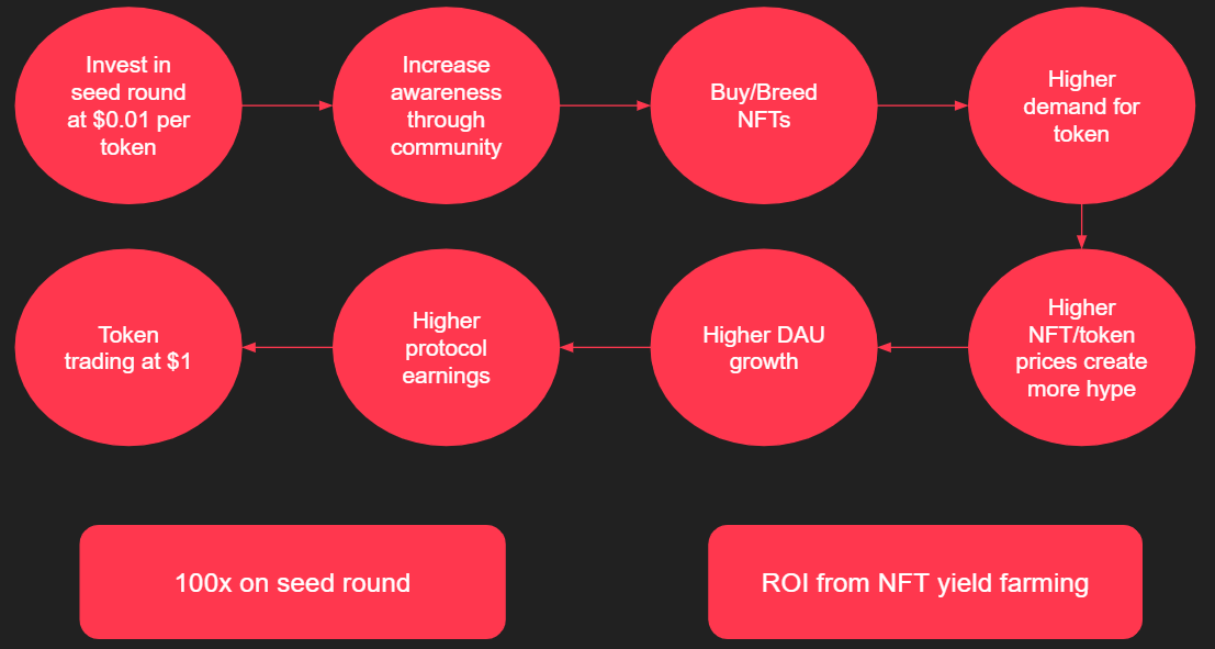 As the game issues NFTs, guilds buy and breed NFTs, creating more demand for token/NFTs, resulting in higher token/NFT prices -> more hype around the game -> higher user growth -> higher protocol earnings -> higher valuation and thus, token price.