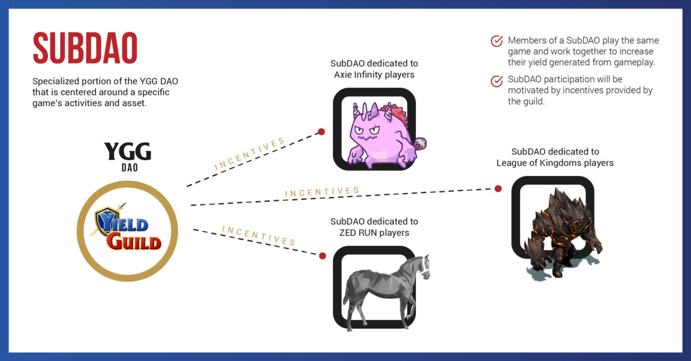 SubDAOs- SubDAOs are the interesting part of the guilds. It is a specialized & localized part of the bigger guild that focuses on a particular game or region.