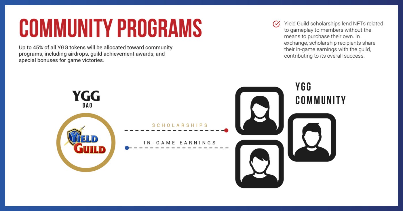 For example, in YGG, up to 45% of YGG tokens are allocated for community programs, including airdrops, awards, and bonuses for game victories.