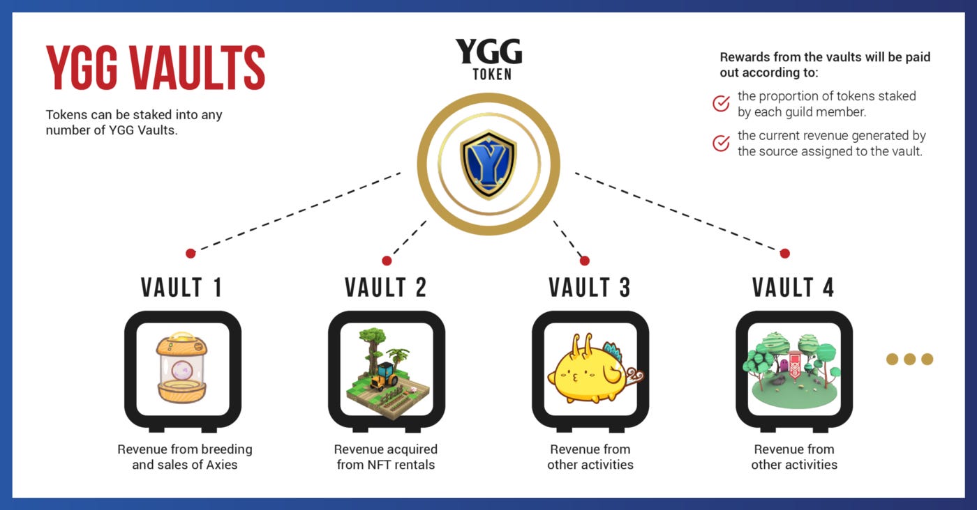 Vaults- Unlike vaults or treasuries in the DeFi ecosystem, typically, tokens are staked to earn fixed-rate interest. On YGG, there are multiple vaults, and each “vault” represents the token rewards from one or all guild revenue sources. This means holders can stack their tokens in any of the vaults.